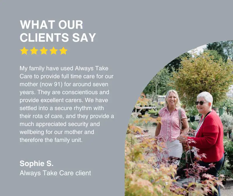 At Always Take Care, we carefully match clients with trained, compassionate carers for as long as possible, reducing unnecessary changes and fostering genuine companionship. This one-to-one care approach helps carers become trusted friends, attuned to your unique needs and preferences.